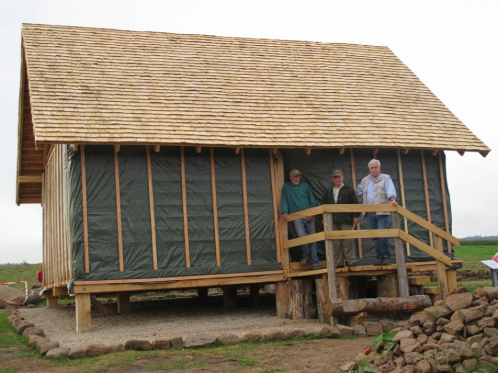 Gestern hat nun der „harte Kern” der Truppe den 6-Pfosten-Bau verpackt. Zunächst wurde eine Gitterkonstruktion angebracht, um dann anschließend die Außenflächen mit Planen abzudecken, die jedoch wegen des oft sehr starken Windes auf Bremscheid ordentlich fixiert werden mussten. So dürfte das Gebäude also bis zum Frühjahr 2014 geschützt sein.Gestern morgen hatten wir eine Außentemperatur von 0 Grad! Es wäre also wirklich nicht sinnvoll, jetzt noch mit dem Lehmputz zu beginnen. Außerdem freuen sich die Helfer nach 5 Monaten Arbeitseinsatz auf eine längere Pause. Über 1.400 Stunden sind in diesen Monaten ehrenamtlich auf der römischen Baustelle gearbeitet worden. Eine tolle Leistung - und das Ergebnis kann sich sehen lassen!