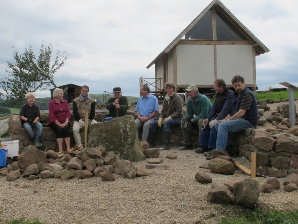 Während der Woche konnte wirklich nur stundenweise  - je nach Wetterlage - gearbeitet werden. Heute war jedoch eine tolle Truppe zusammen, so dass man bis zum ersten richtigen Regenguss um 15.00 Uhr sehen konnte, wie die Exedra sich dem annähert, was sie werden soll: ein Sitzkreis. Eine erste Sitzprobe wurde nach dem Mittagessen selbstverständlich vorgenommen.
