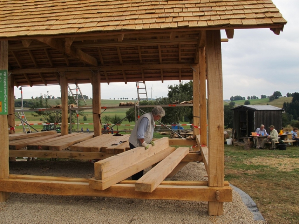 Gleichzeitig wurden auf dem Dach weiter Schindeln verlegt, unser Spezialist für Holznägel stellte Holznägel her, die Bohlen für den Innenboden wurden nachbearbeitet, neue Infotafeln sind aufgestellt worden, eine Zuwegung vom Greifenkopf zum 6-Pfostenbau wurde hergestellt......