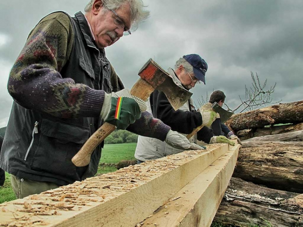Helfer mit einer Vorahnung was erwartet wird, jedoch auch Helfer die sagten „das möchte ich lernen“ sind am Samstag, 18.05.2013 zum Infopunkt gekommen. Als Handwerkszeug stehen Beile in verschiedenen Größen zur Verfügung. Vorsichtig fallen die ersten Schläge in das Holz mit den Beilen aus. Das ändert sich jedoch nach den ersten Versuchen und schon bald sind regelmäßige Schläge zu hören und man sieht wie sich die Balken verändern.