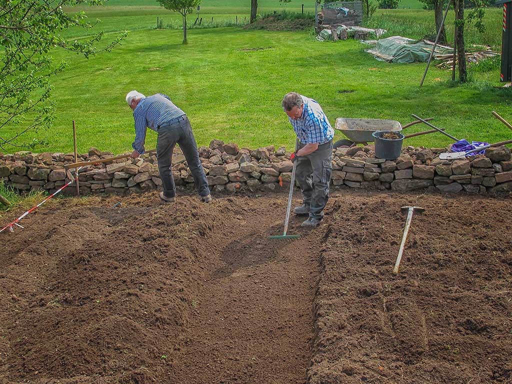 Der Anfang ist gemacht: Unkraut wurde gejätet und der Boden aufgelockert - die Beete sind vorbereitet. Als nächster Schritt muss nun der Stakettenzaun als Abgrenzung und Schutz vor Hasen, Rehen und sonstigen Tieren befestigt werden und dann kann gepflanzt werden.