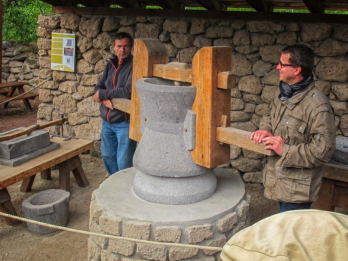 Vom Tuffabbau wechselten wir am Nachmittag zum Basaltabbau. Terra Vulcania nennt sich das Erlebnismuseum, das sich mit 7.000-jähriger Abbaugeschichte des vulkanischen Basalts befasst. Ein Museum, in dem die Besucher animiert werden, mitzumachen, dass aber auch zeigt, wie schwer und gefährlich die Arbeit unserer Vorfahren war.